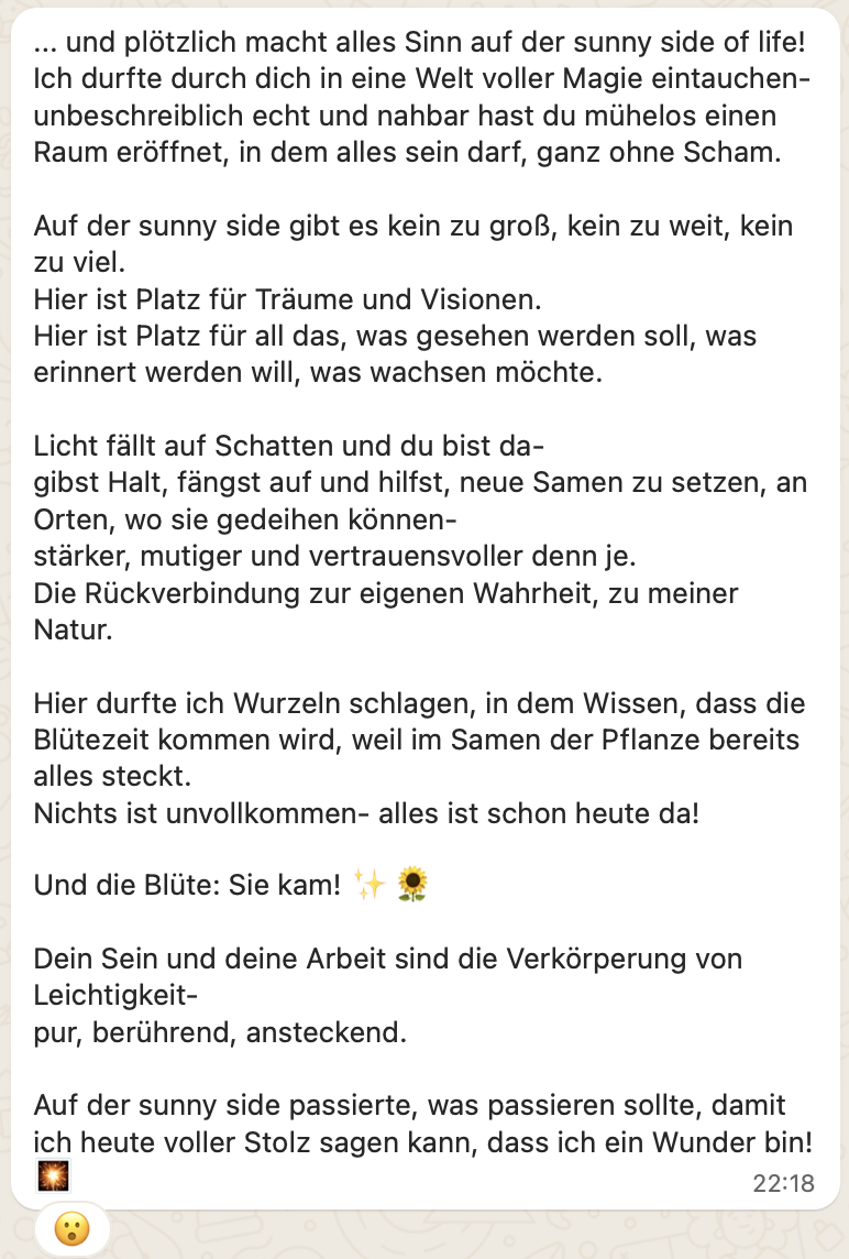 Das ist der schönste Antrieb, die schönste Form von "Arbeit"- weil es sich eben nicht so anfühlt. Aber auch wenn du das beruflich nicht brauchst, hilft dir das so sehr in deinen ganzen Beziehungen- wir sind nicht mehr so negativ, genervt und angepasst.